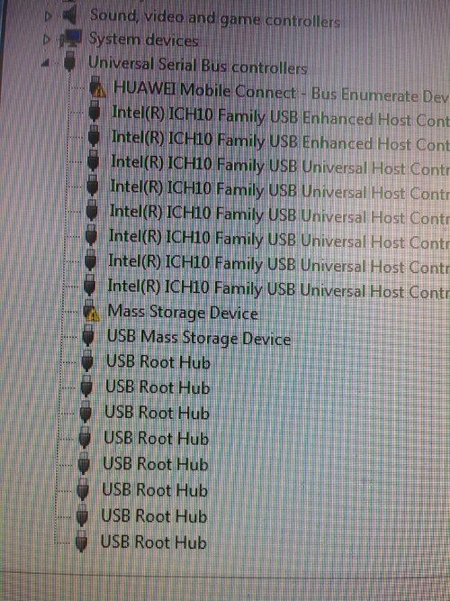 Sejumlah perangkat yang terhubung akan tampil, kemudian cari perangkat anda (biasanya bernama universal serial bus bla bla bla atau usb bla bla bla) yang berwarna kuning dengan tanda seru (lihat gambar dibawah, contoh saya namanya mass storage ……….)
