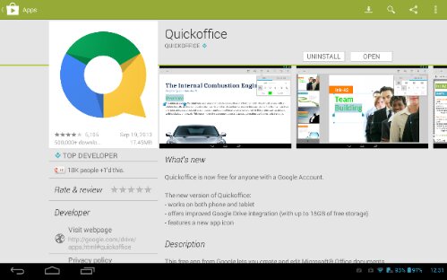 Quickoffice, aplikasi office yang sangat user friendly untuk melakukan editing terhadap file Ms Word (doc), Excel (xls), dan Powerpoint (ppt) sebelumnya adalah aplikasi berbayar yang cukup mahal. Lupakan harganya yang mahal itu, kini Google telah menggratiskannya. Walaupun fitur yang dimiiki telah cukup lengkap bagi pengguna awam, tetapi tetap saja aplikasi ini maupun pesaingnya seperti Kingsoft office dan Polaris Office tidak akan bisa menyaingi aplikasi MS Office aslinya. Aplikasi editing mobile semacam ini memang hanya cocok untuk melakukan editing ringan. Contoh kelemahannya yang cukup sederhana adalah tidak adanya ruler untuk mengatur margin yang bermacam macam serta tidak adanya opsi untuk memasukkan outline numbering yang lengkap (sampai mengatur indentasi dan format angka).