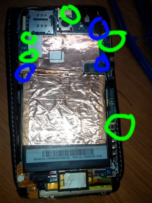 Bagian yang dilingkari hijau adalah sekrup yang perlu dibuka, sedangkan bagian yang dilingkari biru adalah konektor yang perlu dilepaskan. Kedua hal ini perlu dilakukan untuk mencegah anda tidak sengaja memutuskan atau mematahkan sesuatu saat mengganti baterai. Setelah selesai, lepaskan penutup tembaga diatas baterai (tidak perlu semua, cukup bagian yang menutupi baterai saja), lalu congkel baterai dengan kartu/pick sampai terangkat. Seperti saat membuka tutup belakang, proses ini juga perlu tenaga karena ada bagian baterai yang direkatkan.