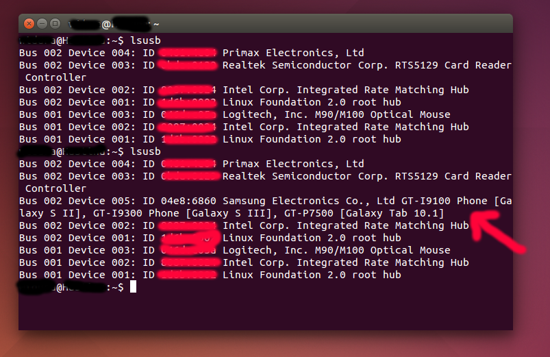3. sambungkan gadget anda ke komputer, ketik kembali “lsusb”, perhatikan list yang berbeda sebelum dan sesudah anda menghubungkan gadget ke komputer (lihat gambar di bawah) dan ingat angka angka sebelum dan sesudah tanda “:” setelah “ID”.