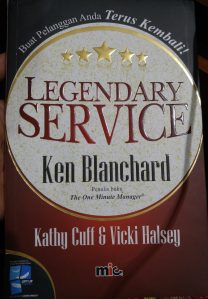 Saya termasuk orang yang rada alergi dengan buku-buku motivasi, apalagi menghadiri acara sejenis yang tidak gratis. Meskipun begitu, buku Legendary Service karya Ken Blanchard ini terasa berbeda. Berawal dari “kecelakaan” akhirnya terhanyut dan tenggelam dalam lembar demi lembar isinya yang meskipun tipis tapi dalam maknanya, setidaknya bagi Saya. Setiap kali mengalami situasi yang “kacau” isi buku ini yang terngiang di lamunan dan memberikan dorongan untuk terus bertahan dan tidak menyerah. Jangan tertipu oleh judul atau tagline, ini bukan semata-mata soal berjualan atau menarik pelanggan. Buku ini, kalau dimaknai dan dipraktekkan dengan baik, akan berperan besar meningkatkan kualitas hidup kita.